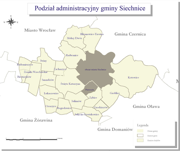 Gmina Siechnice to jedna z trzech gmin miejsko-wiejskich powiatu wrocławskiego. Obejmuje tereny leżące na południowy-wschód od Wrocławia i sąsiaduje z gminami Czernica, Żórawina i Kobierzyce, a także z należącymi do powiatu oławskiego gminami Oława i Domaniów.