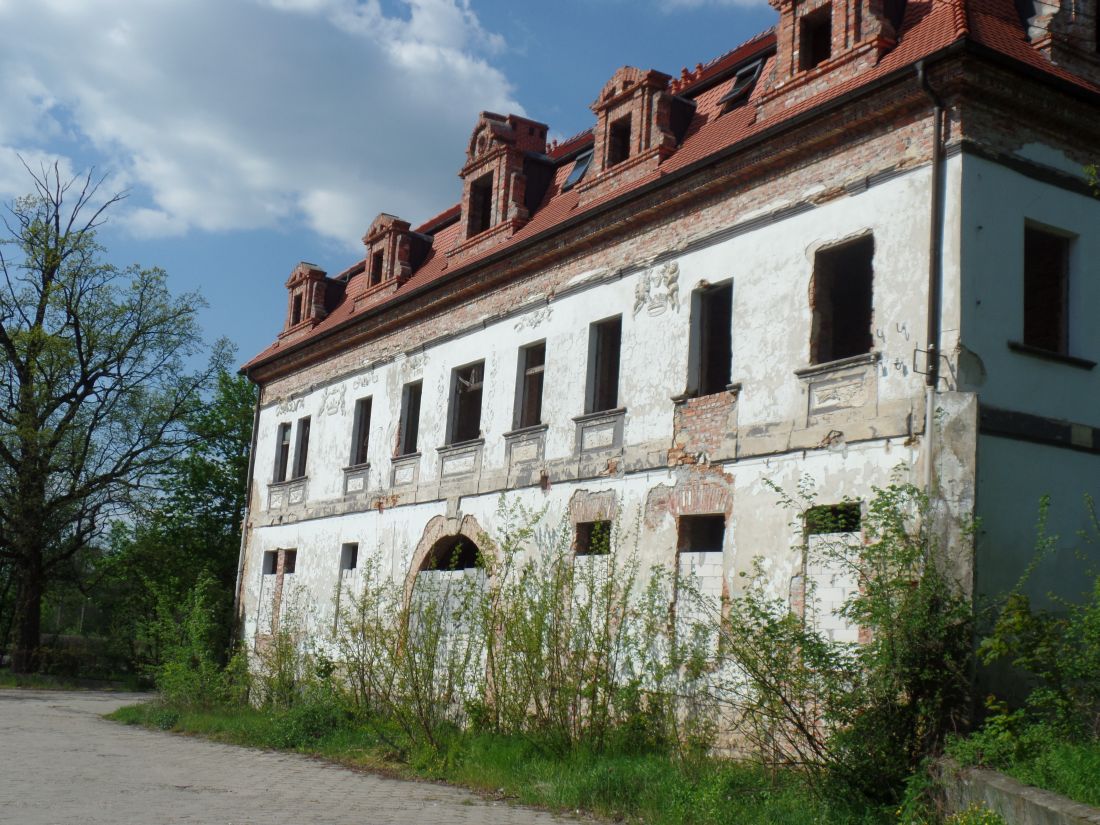 W jej zachodniej części mieści się jednopiętrowy pałac z 1854 roku. Od frontu budynek posiada wejście z gankiem i werandą. Na lewo od wejścia, na wysokości piętra, zachowały się pozostałości kartusza herbowego. Prawdopodobnie symbolizuje on ród von Tempskych, którzy odkupili tę posiadłość w 1858 r., gdy była ona połączona z Oporowem i Mokronosem Dolnym.