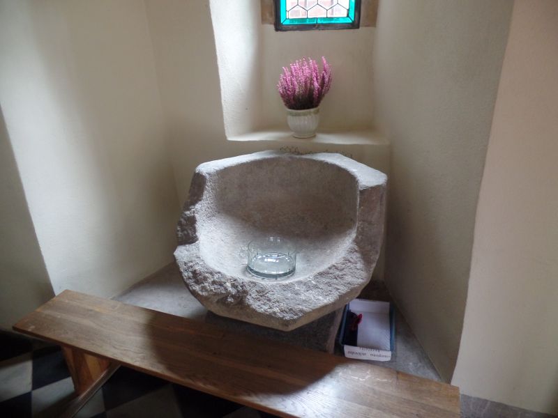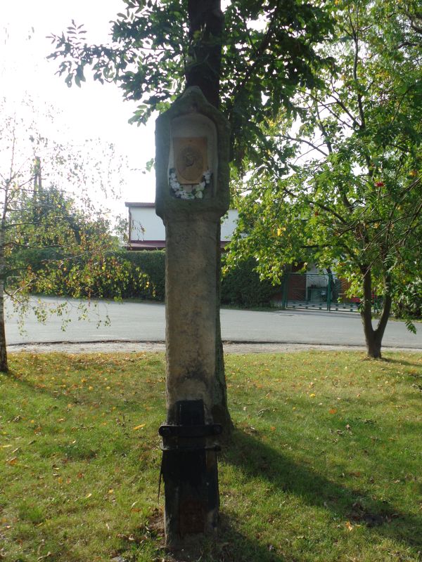 Przed kościołem stoi średniowieczna kapliczka słupowa wykonana z piaskowca, w której umieszczono współczesny już wizerunek Chrystusa.