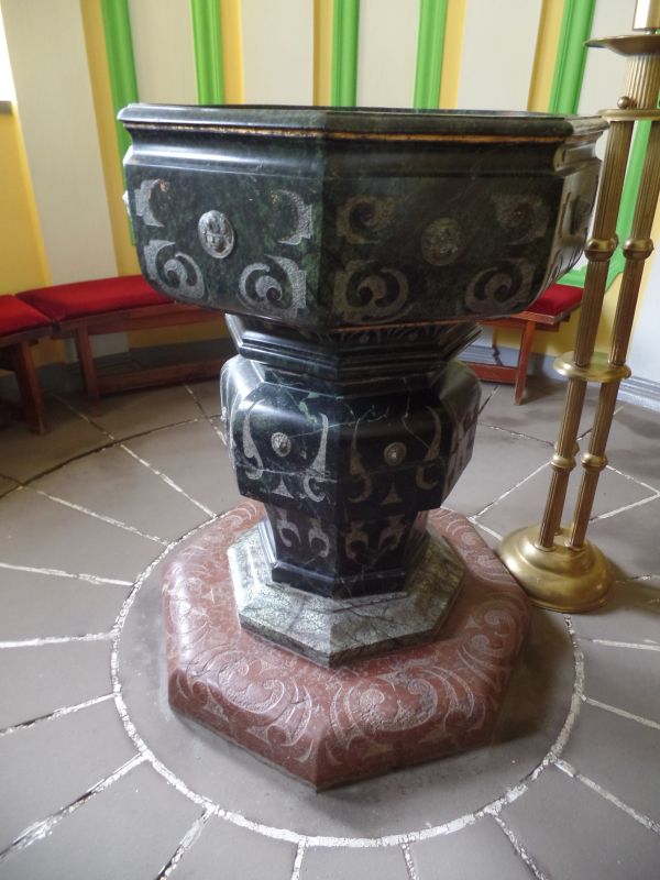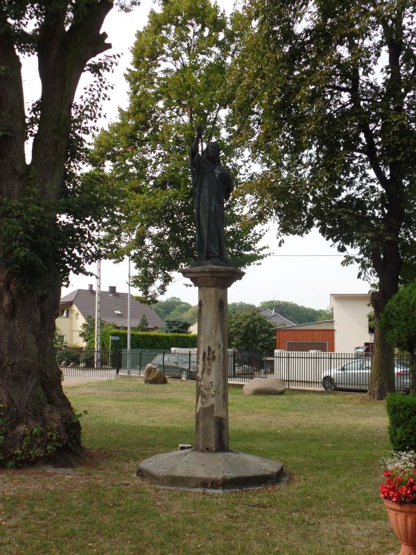 Obok kościoła znajduje się wysoki na 2,2 m pręgierz ustawiony przypuszczalnie pierwotnie w 1517 r. na placu przed fosą naprzeciwko dworu. Na słupie znajdują się pozostałości po hakach i łańcuchach wykorzystywanych do przykuwania skazańców. Obecnie służy jako cokół dla odlanej z brązu figury Chrystusa. Od strony zachodniej przy ogrodzeniu umieszczono 9 głazów narzutowych, na które natrafiono podczas kopania fundamentów kościoła i plebani.